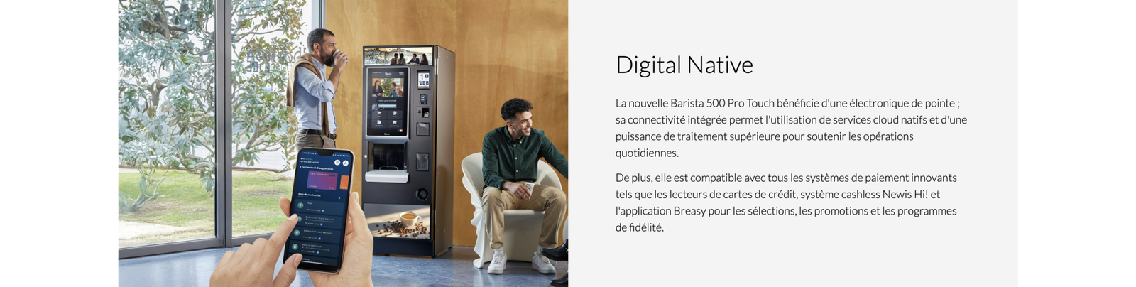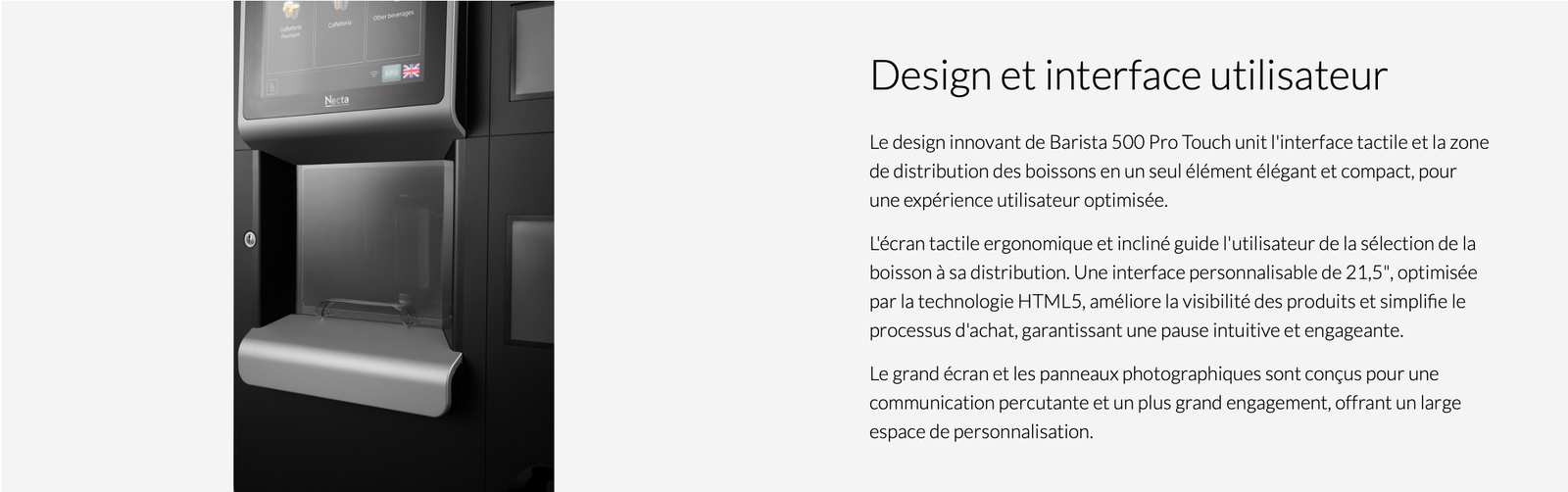 Barista 500 Pro Touch est la nouvelle machine Necta, conçue pour la fiabilité et sublimer votre expérience café. S’appuyant sur le succès éprouvé de la plateforme Necta, Barista 500 Pro Touch bénéficie de nouvelles améliorations, établissant une nouvelle norme en matière de design, de fiabilité et de performance.
