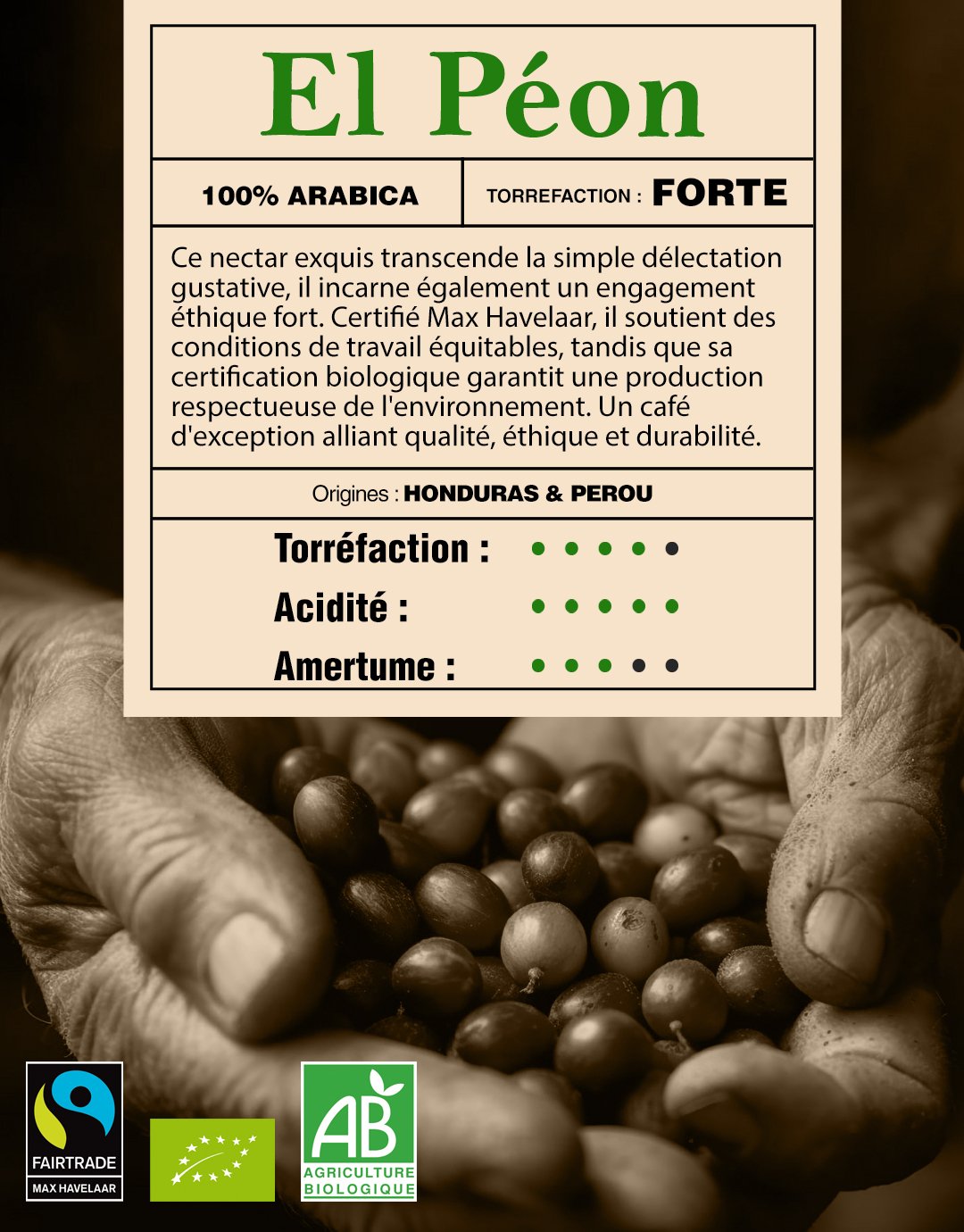 El Peon est un café d’exception, 100 % arabica, cultivé selon les principes de l’agriculture biologique et certifié équitable Max Havelaar. Il séduit par ses arômes délicats et sa qualité constante. Disponible aussi en version décaféinée, il incarne un choix engagé, alliant plaisir, éthique et respect de l’environnement.