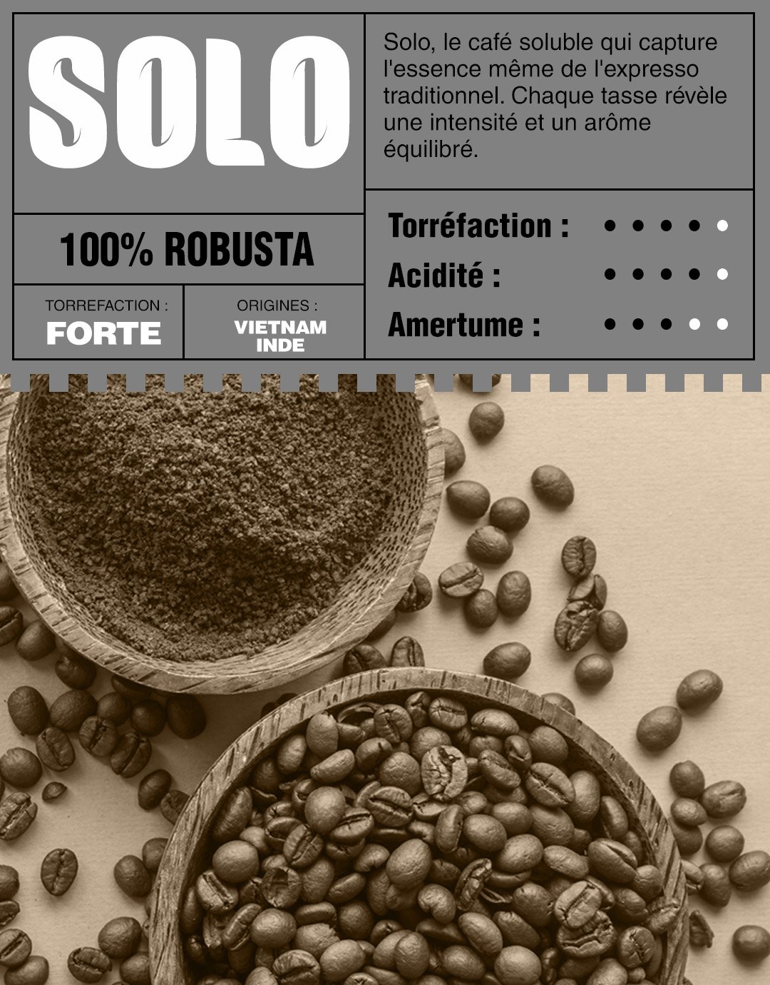 Solo, le café soluble qui capture l’essence même de l’expresso traditionnel. Chaque délicieuse tasse révèle une intensité et un arôme équilibré, offrant une expérience café authentique et raffinée. Pratique et riche en saveurs, le Solo vous transporte instantanément dans l’univers réconfortant du café espresso, où la qualité rencontre la simplicité. Une pause café exceptionnelle à portée de main.