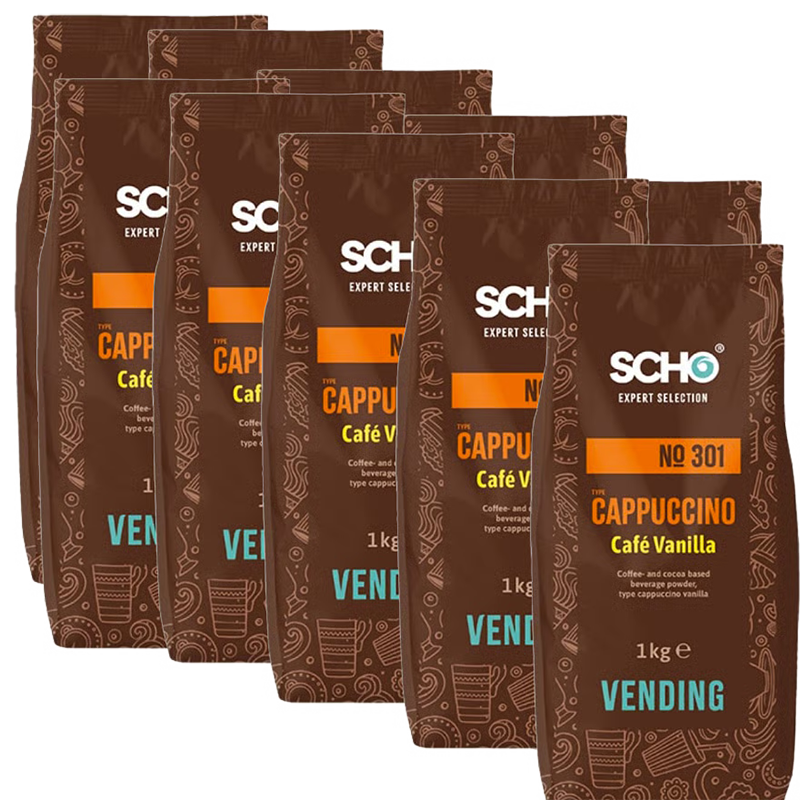 Cappuccino Vanille N°301 – SCHO : Savourez le Cappuccino Café Vanille SCHO®, une boisson instantanée combinant la richesse du café et la douceur subtile de la vanille. Conçu pour les distributeurs automatiques, il garantit une mousse crémeuse et une préparation rapide pour des pauses café gourmandes.