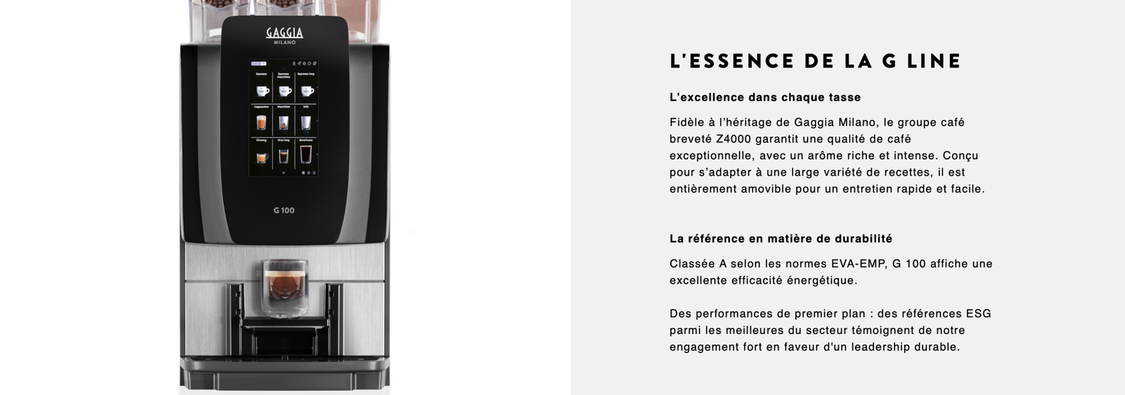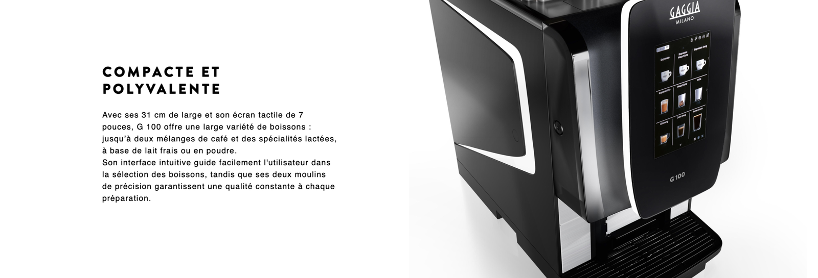 G 100 incarne l’excellence de la gamme Gaggia Milano dans un format compact et polyvalent. Idéale pour les hôtels, restaurants et bureaux, elle assure une performance quotidienne allant jusqu’à 80 tasses, sans compromis sur la qualité.