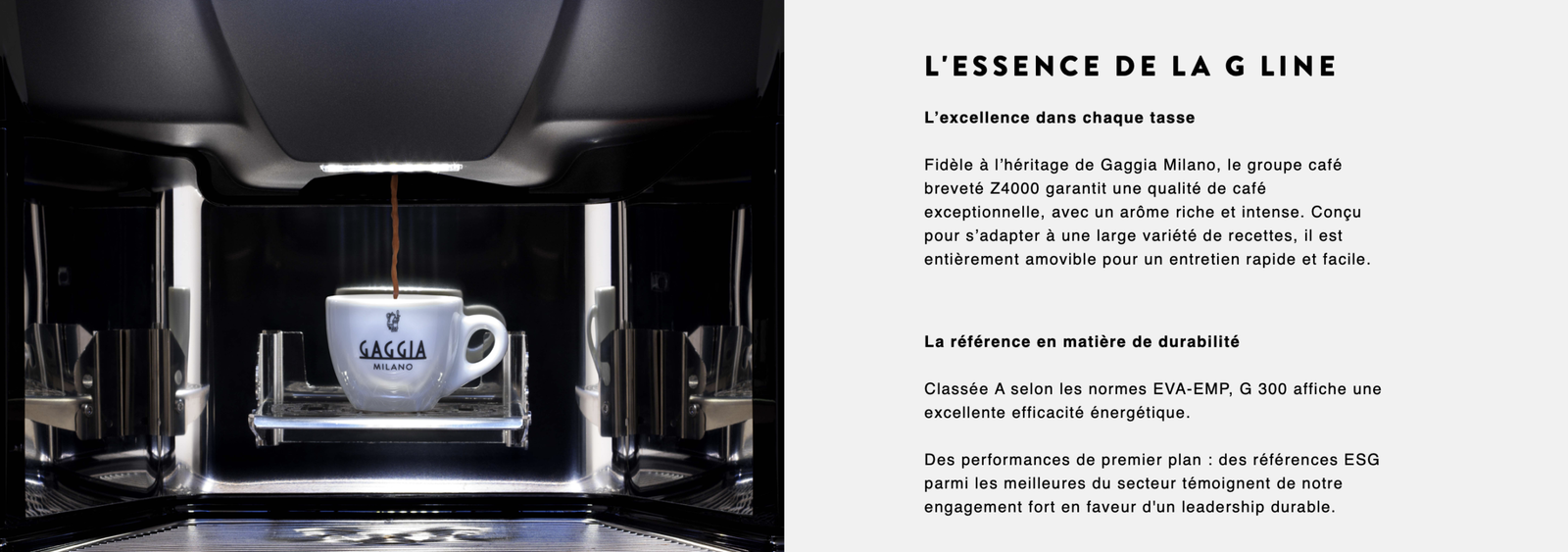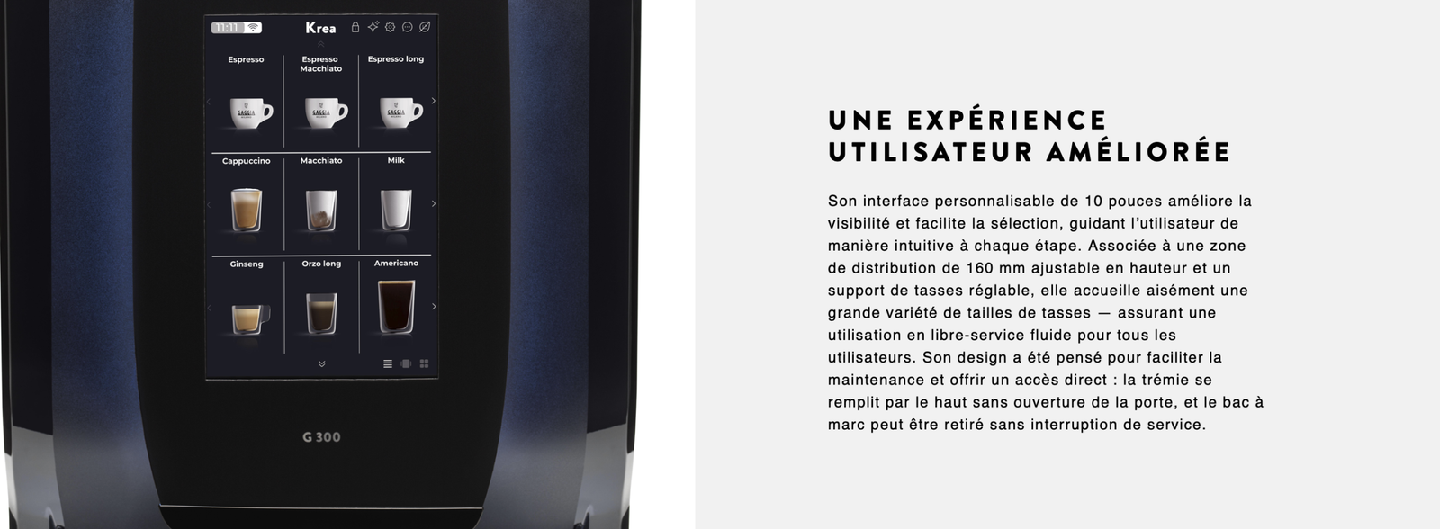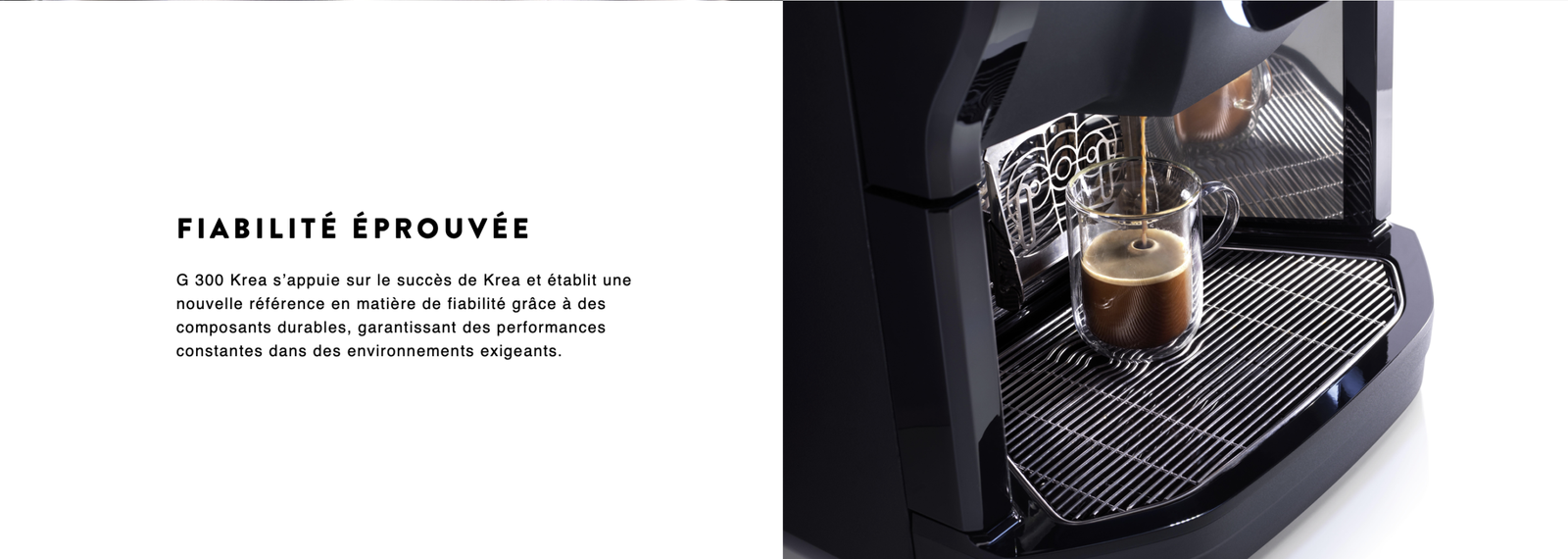 Découvrez G 300 Krea, la nouvelle incarnation de l’excellence signée Gaggia Professional. Héritière du succès du modèle phare Krea, cette machine à expresso super-automatique de nouvelle génération associe la qualité emblématique de Gaggia Milano à une fiabilité renforcée et un design sophistiqué. Avec son esthétique élégante et sa capacité quotidienne pouvant aller jusqu’à 120 boissons, G 300 Krea s’impose comme le choix idéal pour les hôtels, restaurants, bureaux modernes et corners entreprises à la recherche d’un café premium et de performances optimales.