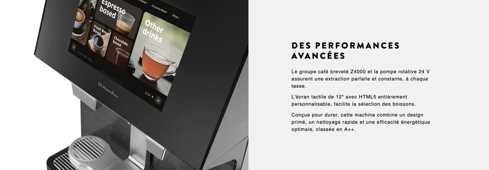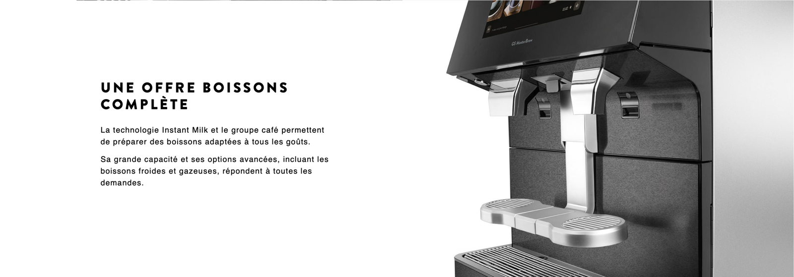 GS MasterBrew est un modèle super automatique de la gamme G line, dédiée à la préparation de boissons de “spécialités”.