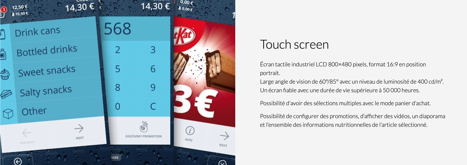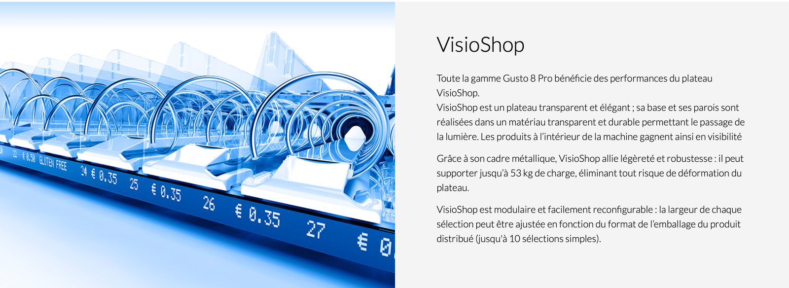 Au‑delà de ses innovations — comme les plateaux modulaires VisioShop et sa haute efficacité énergétique — ce modèle propose une zone de sélection tactile simple et intuitive. L’écran facilite la sélection des produits et l’accès aux informations. Les utilisateurs peuvent parcourir l’offre et acheter plusieurs produits en une seule transaction, tandis que les opérateurs peuvent adapter l’assortiment à chaque site.Le modèle conserve le design élégant du Gusto 8 Pro.Innovations technologiques, esthétique soignée et écran tactile innovant en font la solution la plus performante pour les sites premium.